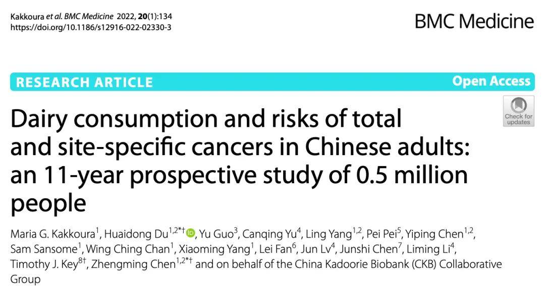 2022年5月,牛津大学、中国医学科学院和北京大学的研究人员合作,在 BMC Medicine 期刊发表了题为:Dairy consumption and risks of total and site-specific cancers in Chinese adults: an 11-year prospective study of 0.5 million people 的研究论文。