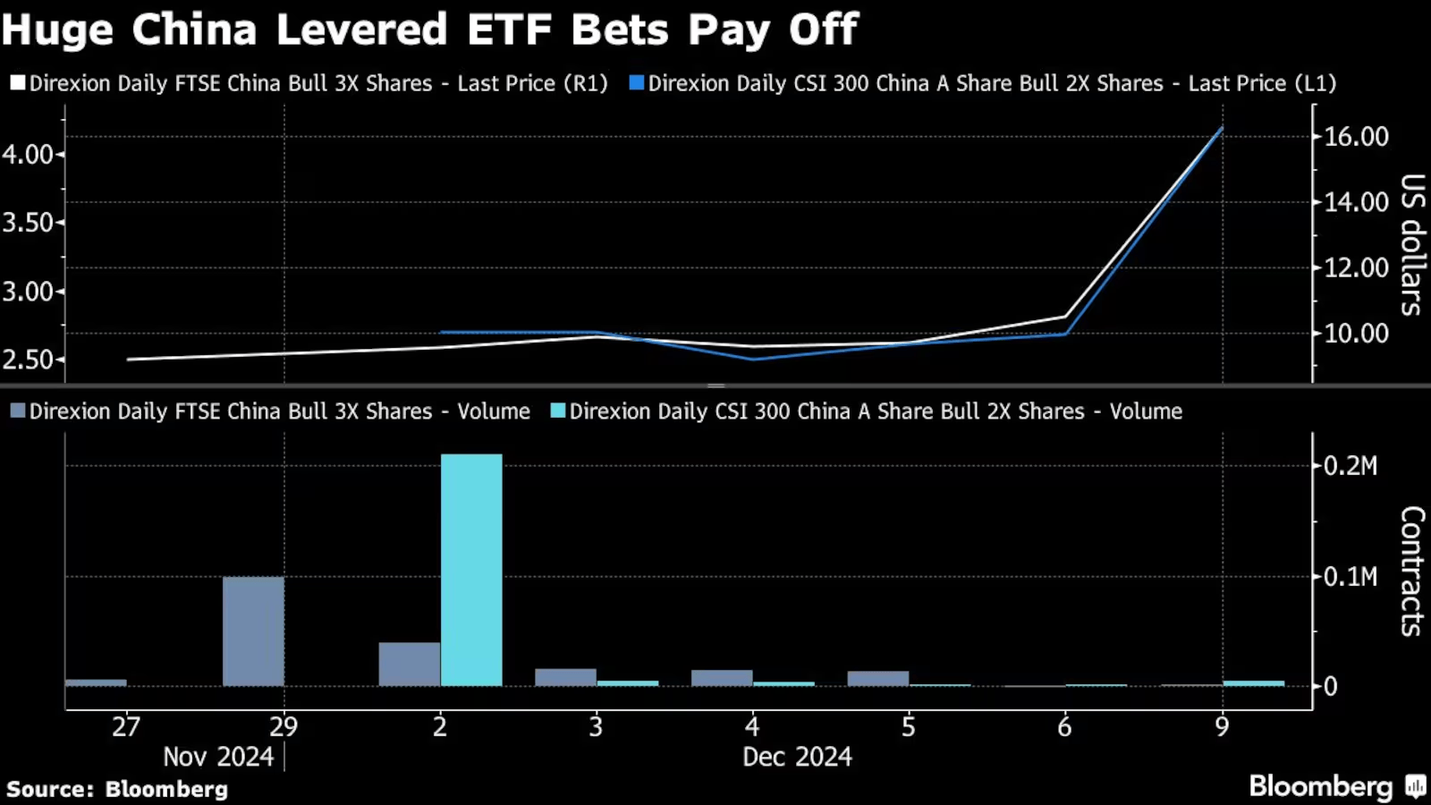 海外上市的众多中概股和相关ETF也录得大幅上涨,其中,二倍做多沪深300ETF-Direxion和三倍做多FTSE中国ETF-Direxion美东时间周一分别大涨13.32%和23.78%。截至当地时间周一早盘,提前布局这两个ETF看涨期权的华尔街神秘资金已浮盈1.38亿美元(约10亿元人民币)。