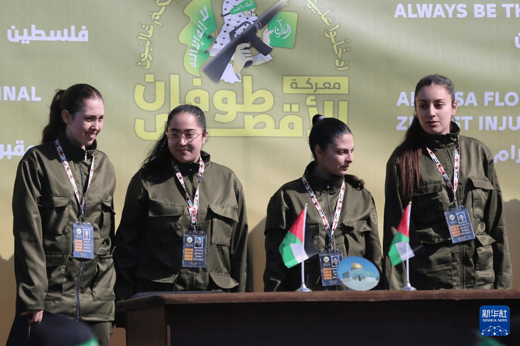 据参考消息援引法新社报道,4名女性人质身着军装,在台上微笑挥手,身后有用希伯来语书写的“犹太复国主义不会获胜”标语。