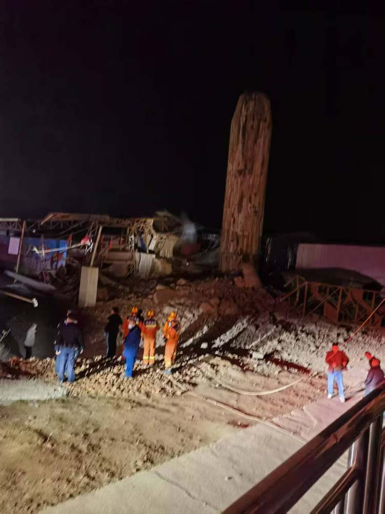 另一名目击者提供的图片显示,倒塌的烟囱砸倒了钢构结构的厂房,地面散落着混凝土和砖石碎片,公安、消防正在现场处置。