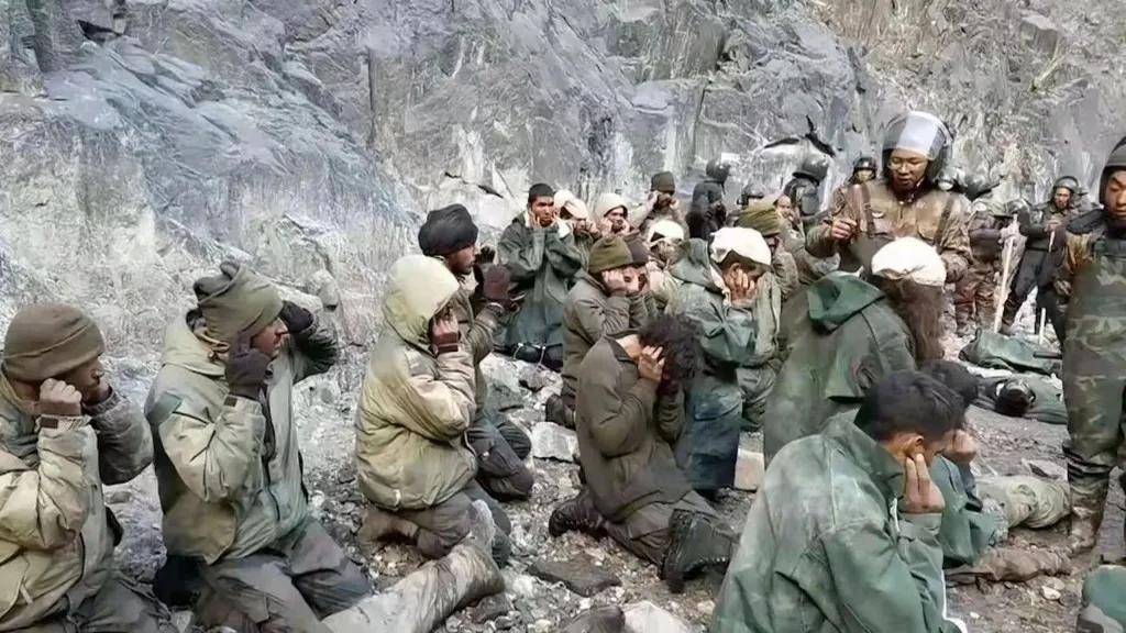 ▲加勒万河谷冲突,印军俘虏跪地投降,解放军在清点人数