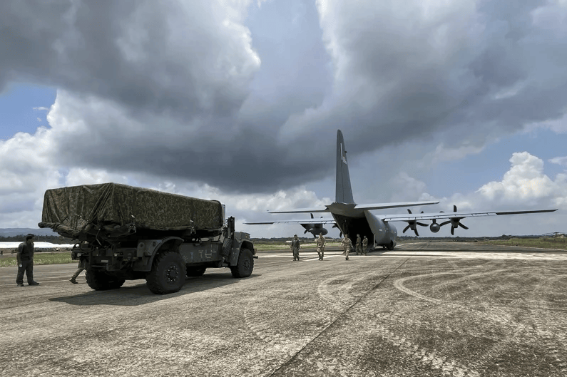 4月26日,在美菲年度“肩并肩”演习中,美军反舰系统的一部分,装载在一架美国C130军用飞机上。(图源:美联社)